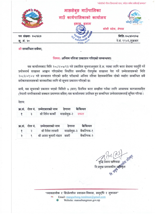 अन्तिम नतिजा प्रकाशन गरिएको सम्बन्धमा। विज्ञापन नम्बर - ४-२०८२/८३ पद: हे.अ