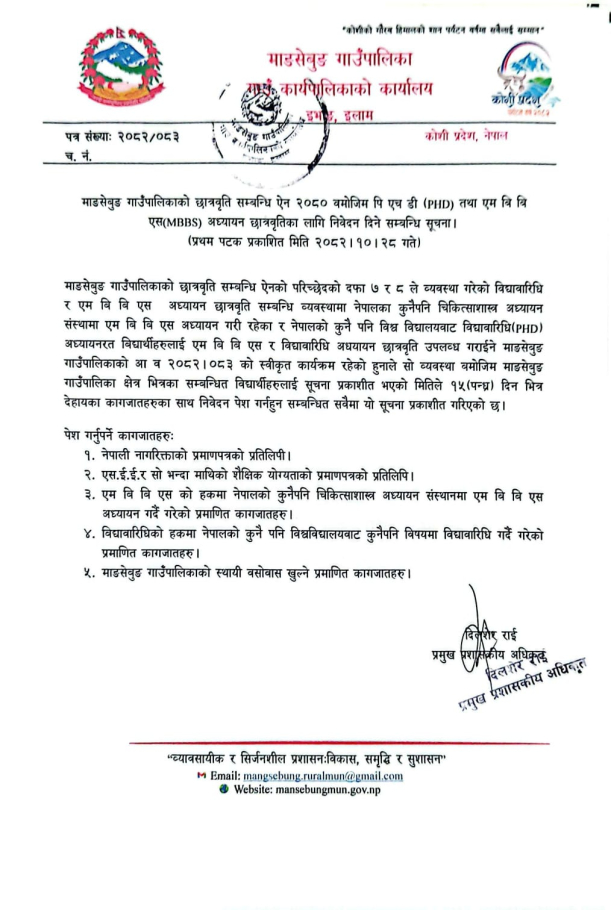 MBBS छात्रवृत्तिका लागि निवेदन सम्बन्धि सूचना ।