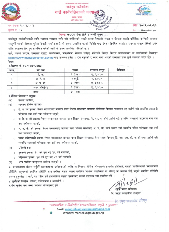 करारमा सेवा लिने सम्बन्धी सूचना । ( विज्ञापन नं ०४/२०८२/०८३, पद: हेअ, अहेब, अनमी र ल्याब असिष्टेण्ड )